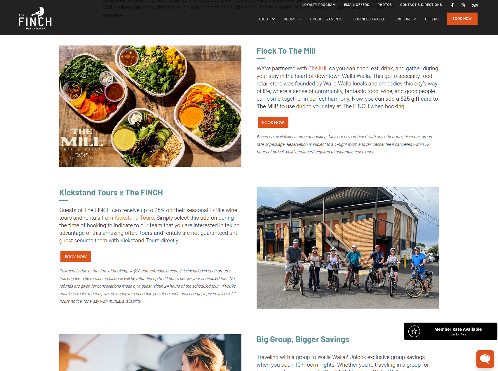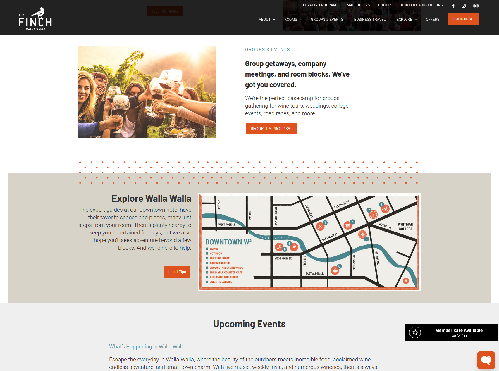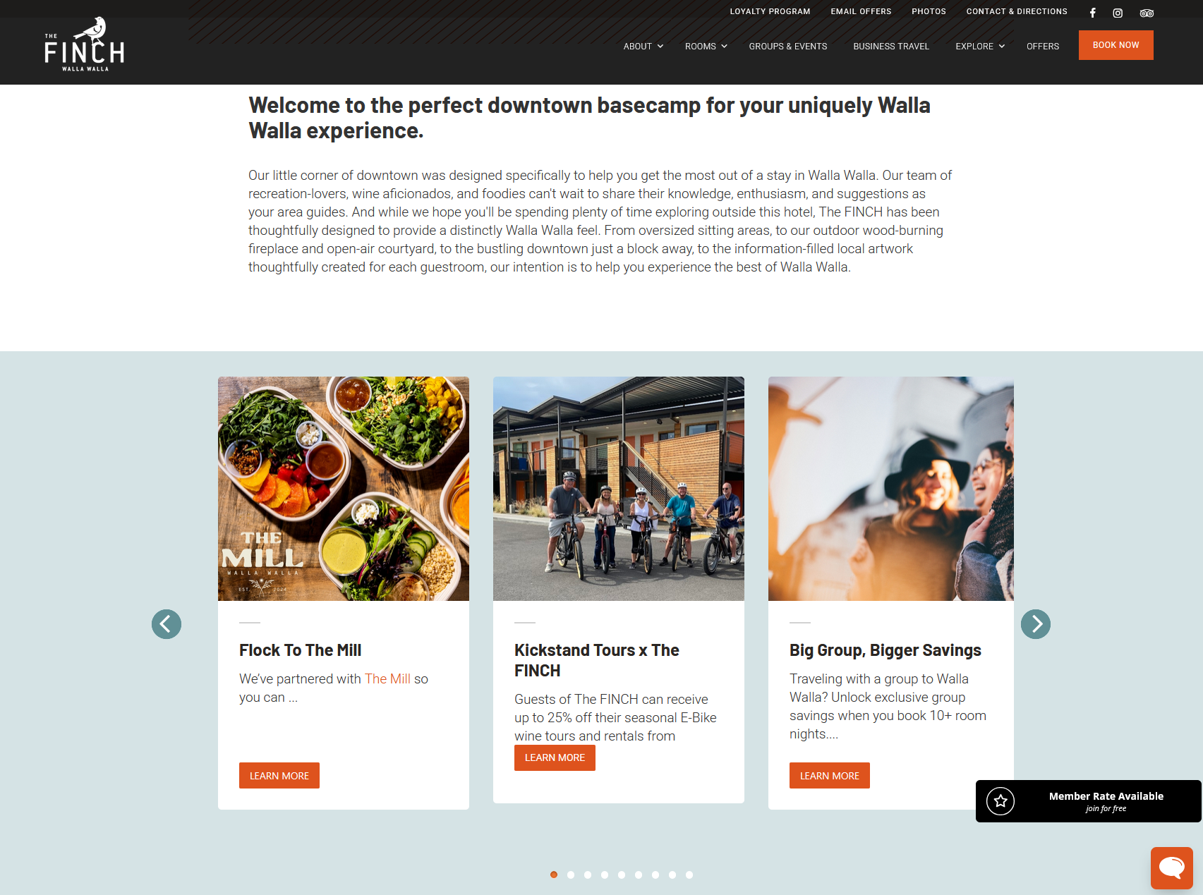 For The Finch, a boutique hotel in Walla Walla, WA, I created a fresh, modern website that captures the property’s playful personality and connection to local wine country. The redesign emphasized bold visuals, clean layouts, and mobile-friendly functionality, making it easy for guests to explore rooms, amenities, and the surrounding community. With streamlined booking integration and an engaging visual style, the site delivers a seamless user experience that reflects The Finch’s vibrant brand.